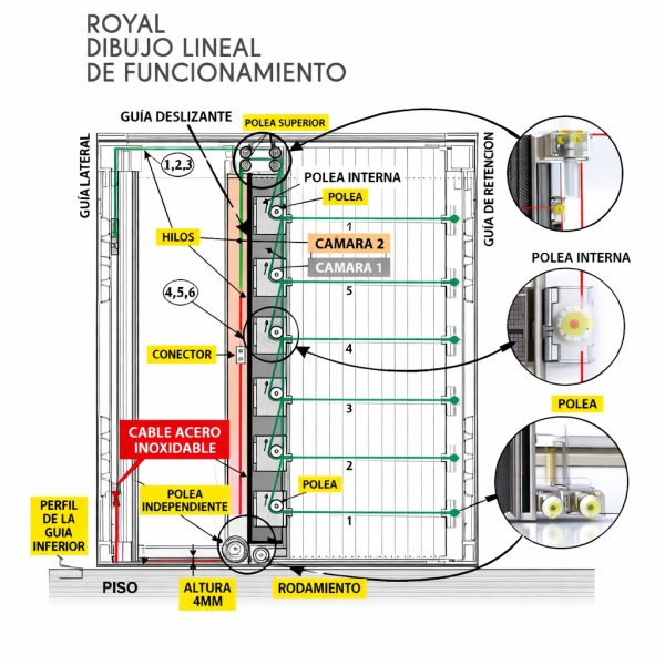 Rodamientos en la parte superior y polea interior para evitar el rozamiento de los hilos.